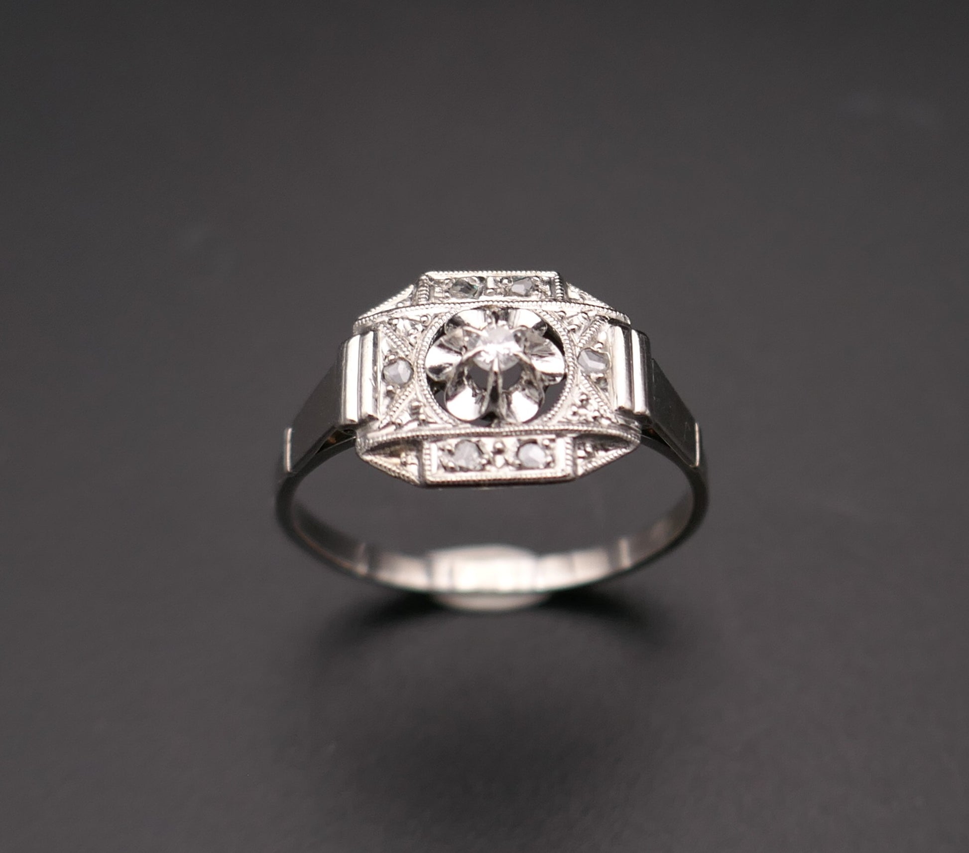 Bague Art Déco sertie d’un diamant et de 6 autres diamants taille rose.