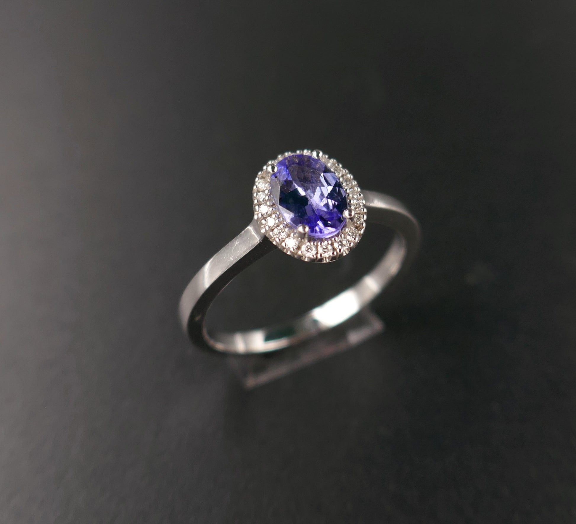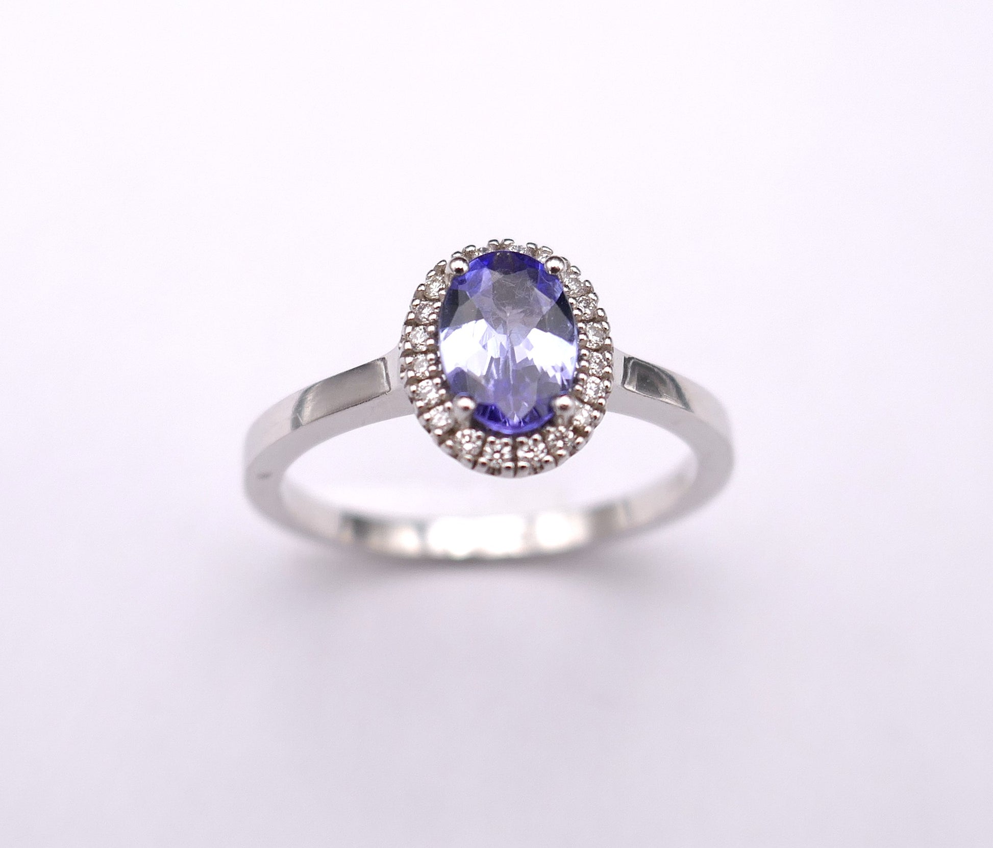 Bague en or blanc 18 carats sertie d'un saphir de taille ovale dans un entourage de diamants. Dimensions du motif saphir et diamants: 9,2 mm x 7,2 mm