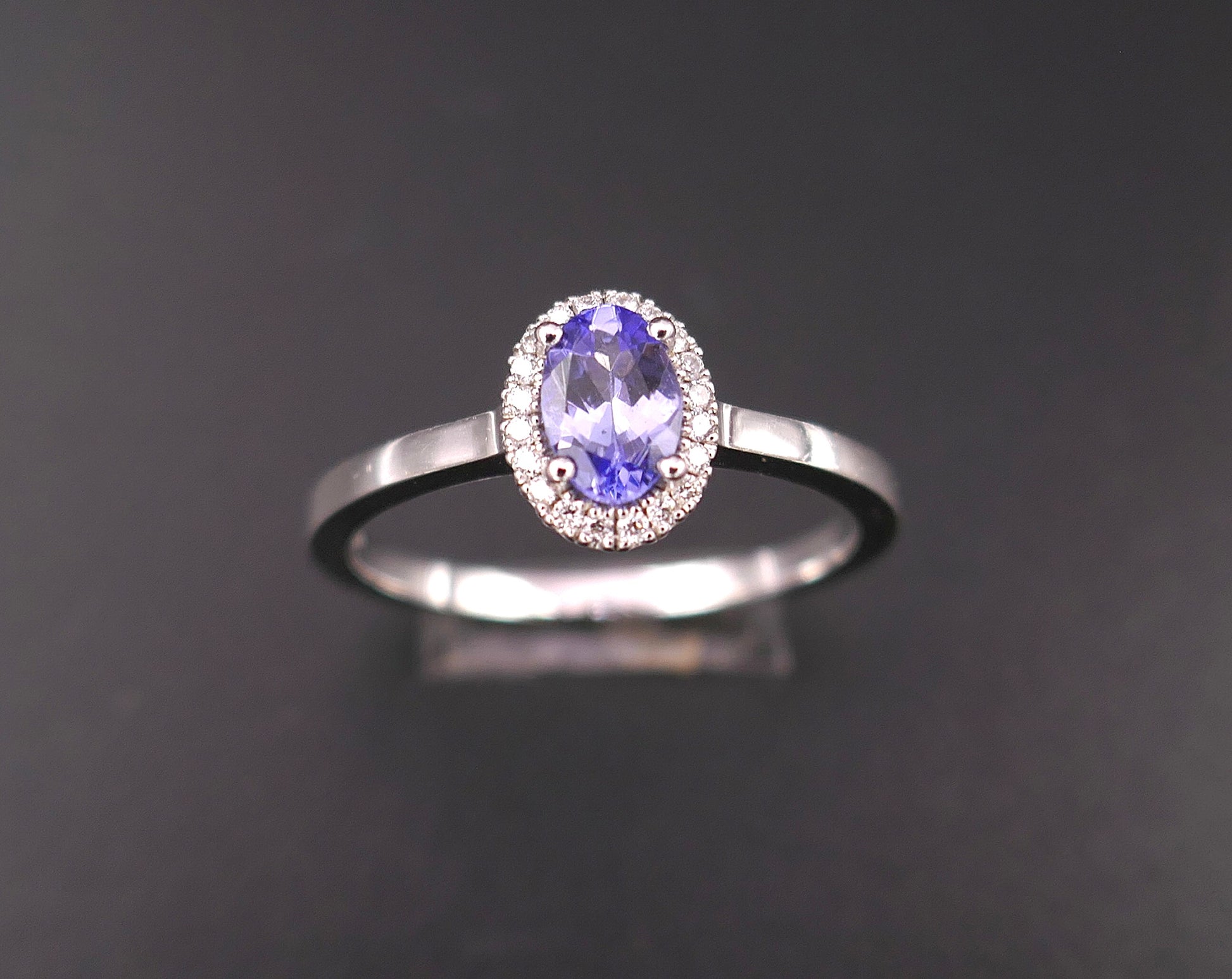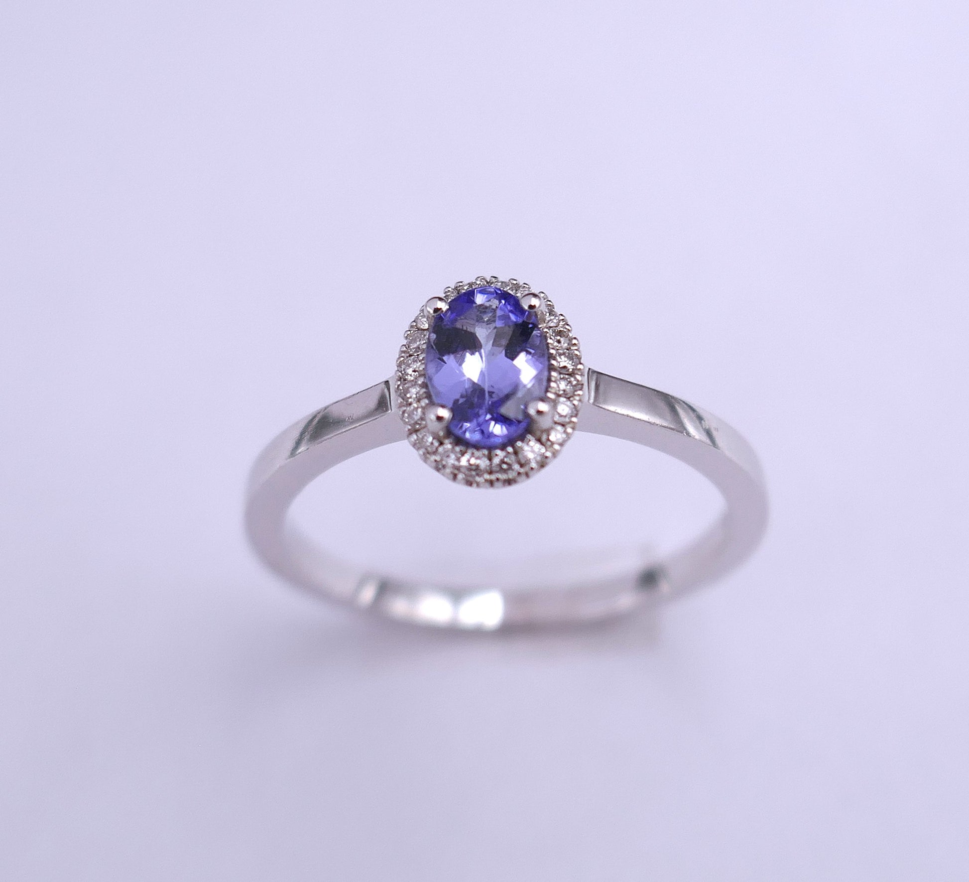 Bague en or blanc 18 carats sertie d'un saphir de taille ovale dans un entourage de diamants. Dimensions du motif saphir et diamants: 8,2 mm x 6,7 mm