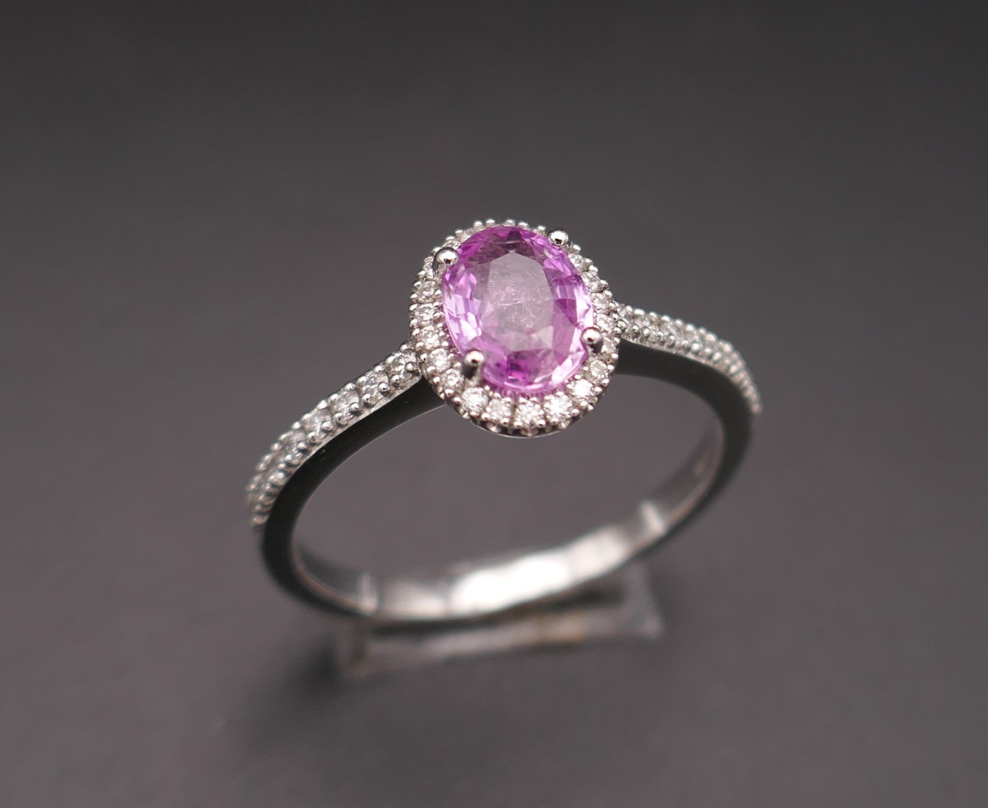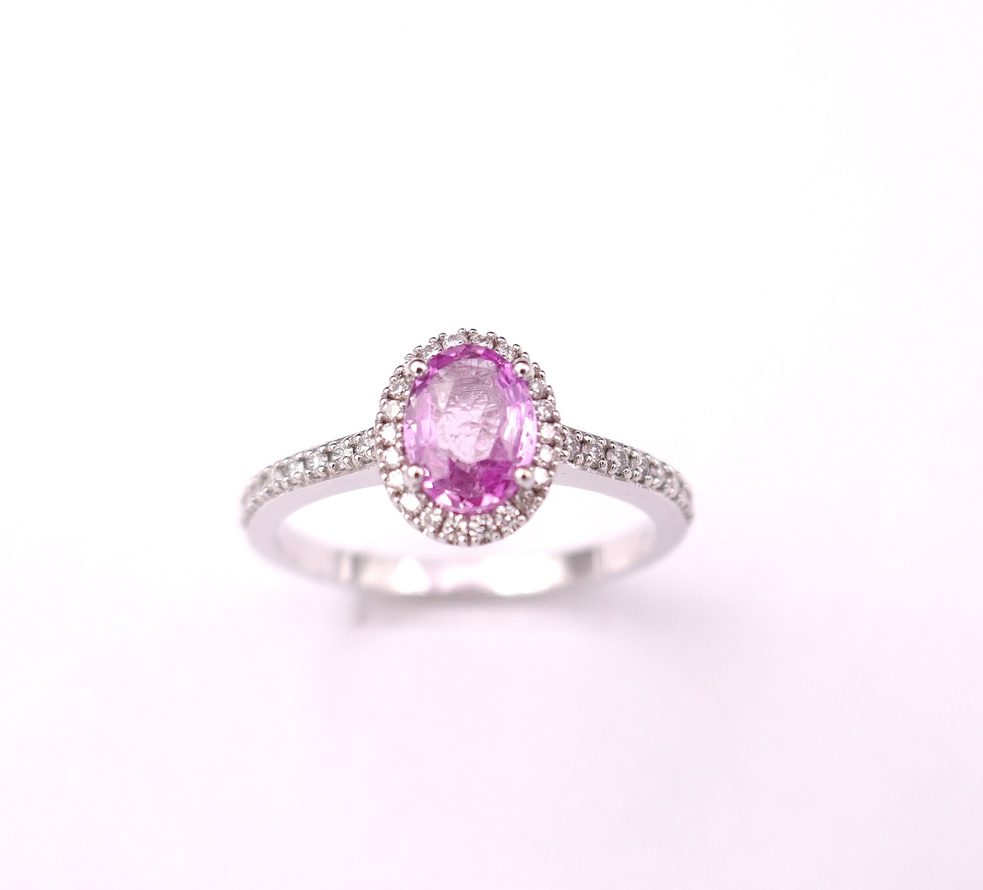 Bague en or blanc 18 carats sertie d'un saphir rose de taille ovale dans un entourage de diamants, la monture pavée de diamants.
