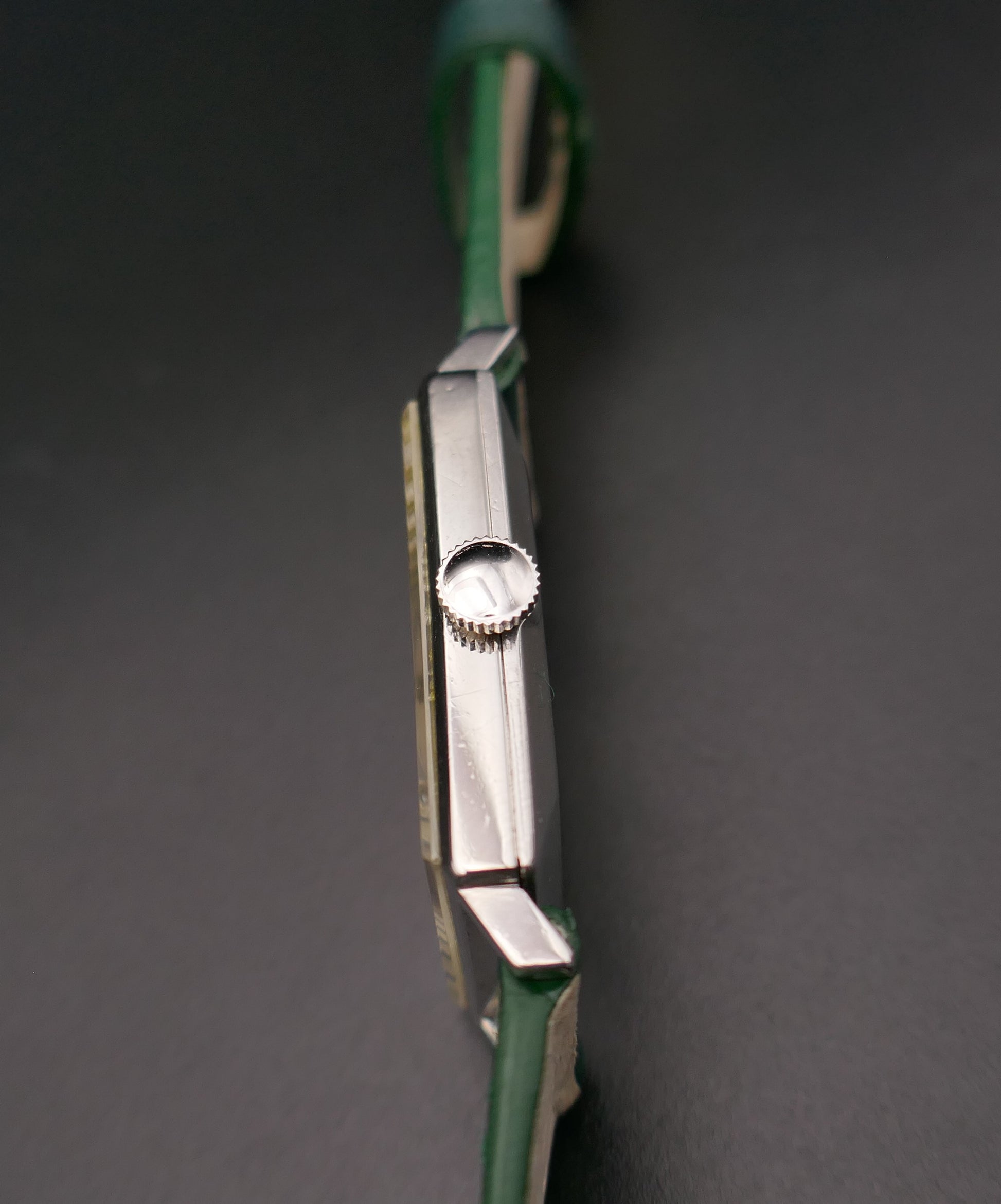 JAEGER-leCoultre, Montre de forme rectangulaire en acier. Mouvement mécanique à remontage manuel. Dimensions du boitier: 2,3 cm x 2,8 cm (sans les anses). Bracelet vert foncé neuf. Quelques micro rayures d'usage. Cadran légèrement piqué (voir photo). La montre a été révisée et fonctionne parfaitement. Livrée dans un écrin et avec une facture. Expédition gratuite et assurée.